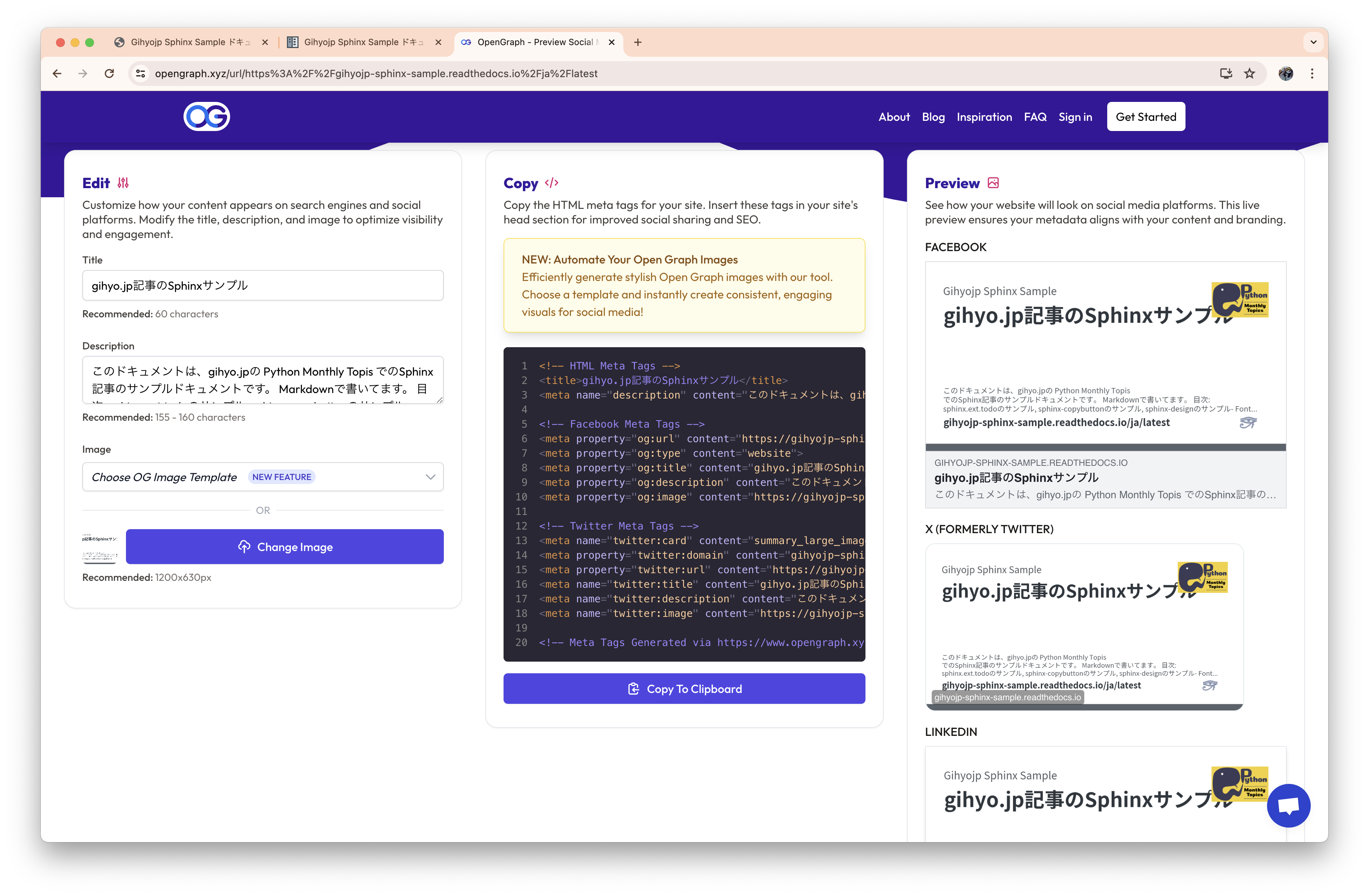 sphinxext-opengraphOGP(Open Graph Protocol)用のメタデータ、画像を生成する拡張機能です。 これらの情報が適切に設定してあると、WebページをSNS等で共有したときに画像や説明文が適切に入るため、リンク先の内容がわかりやすくなります。