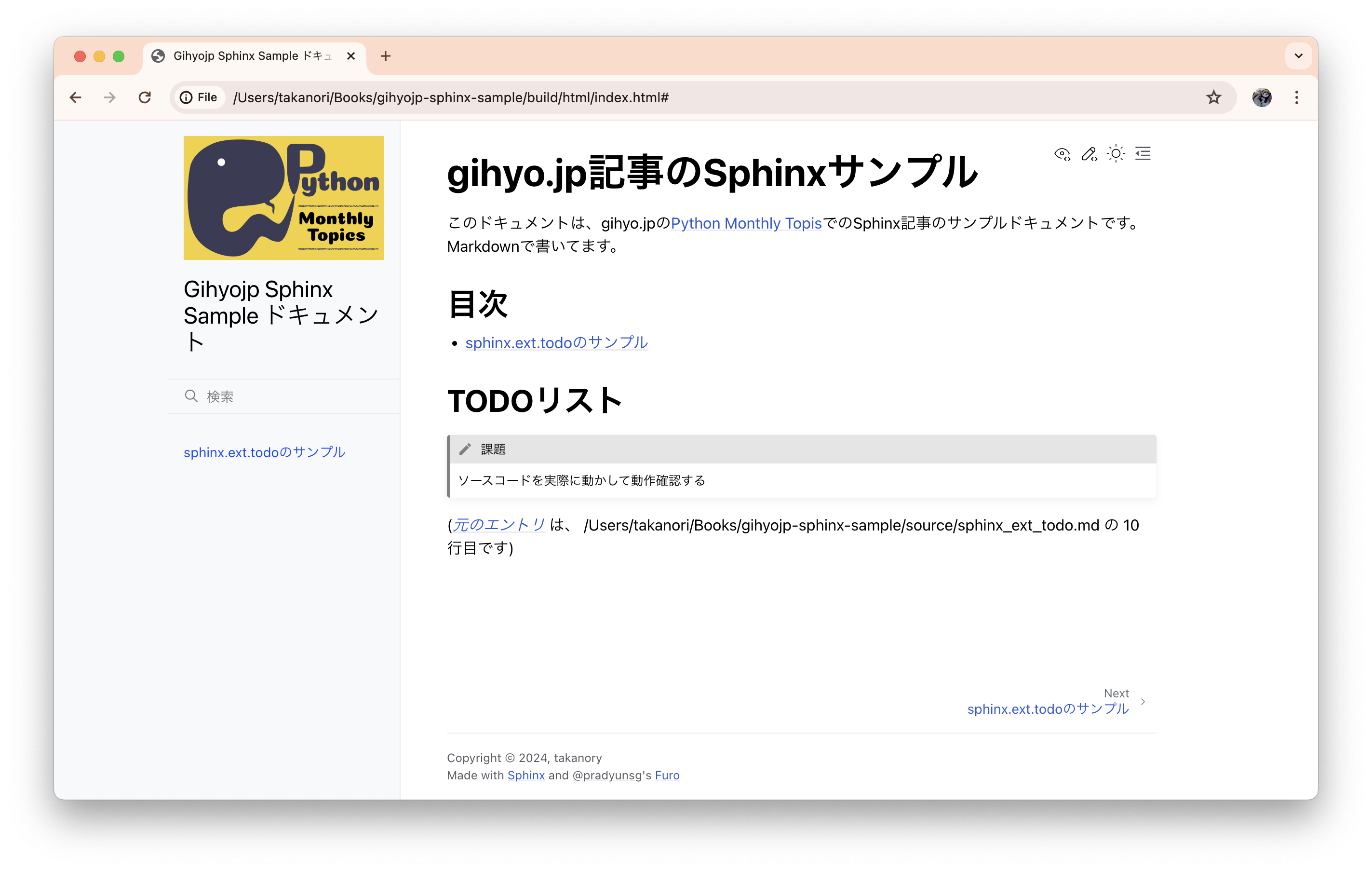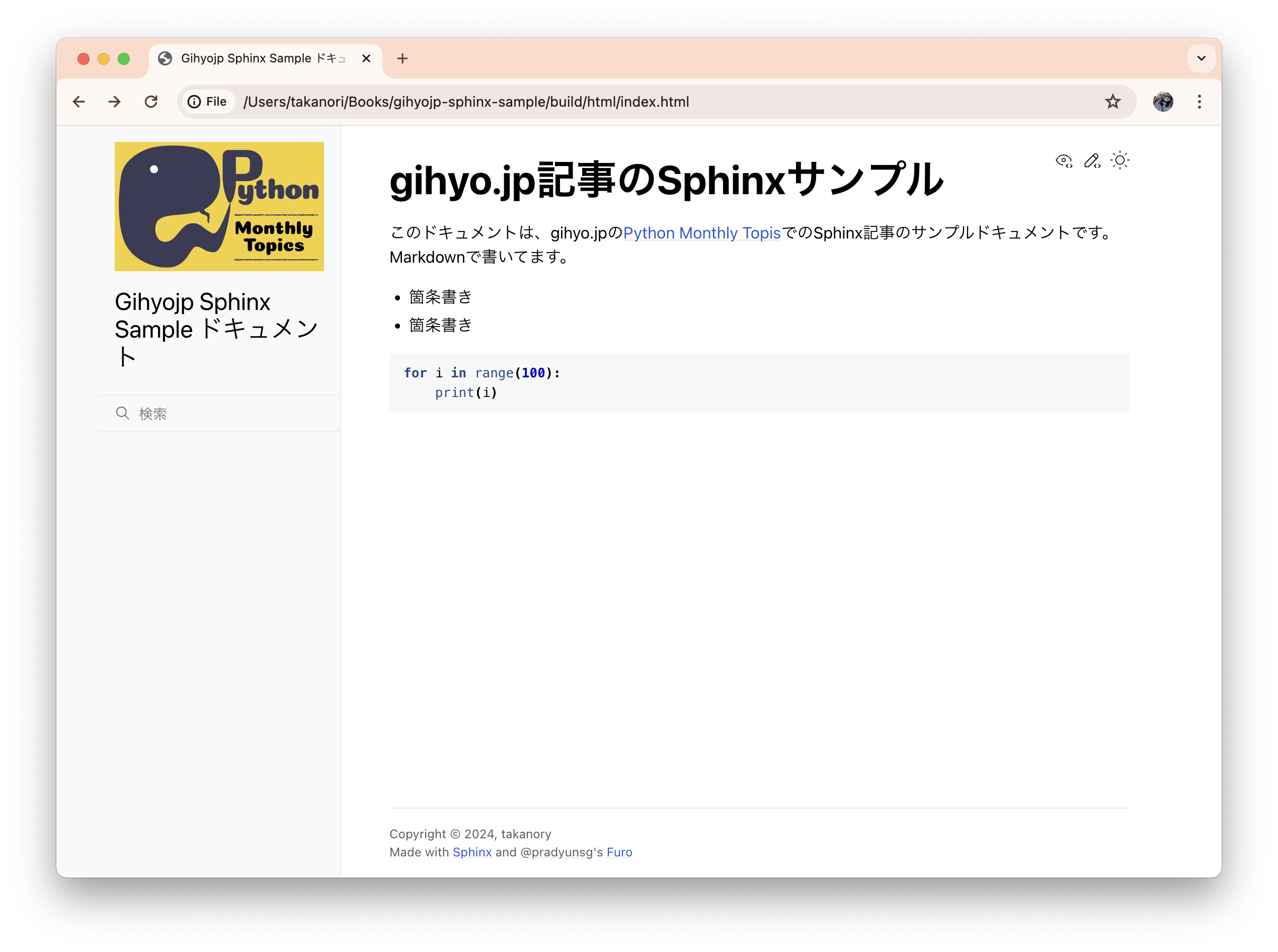 <meta name="description" content="このドキュメントは、gihyo.jpの Python Monthly Topis でのSphinx記事のサンプルドキュメントです。 Markdownで書いてます。 目次: sphinx.ext.todoのサンプル, sphinx-copybuttonのサンプル, sphinx-designのサンプル- Font Awesome, Material Icons.. TODOリスト:( 元のエン..." />