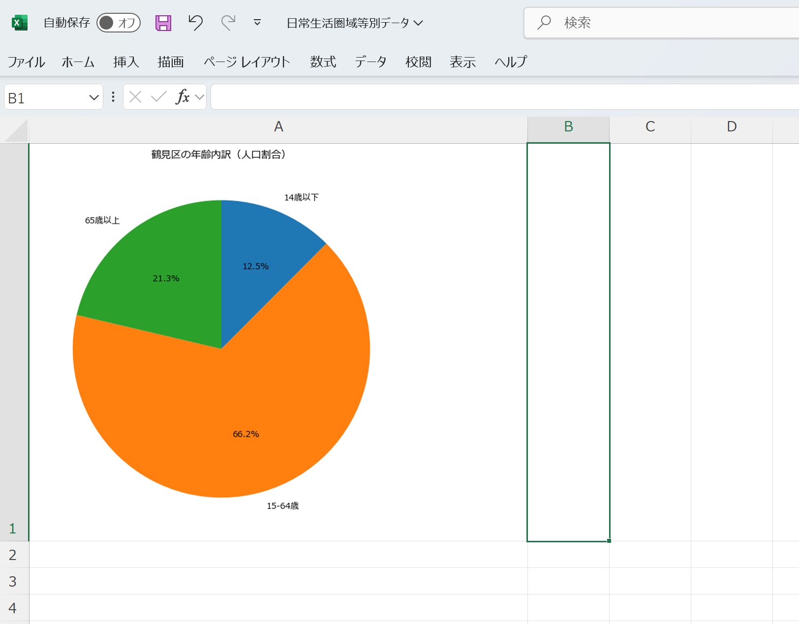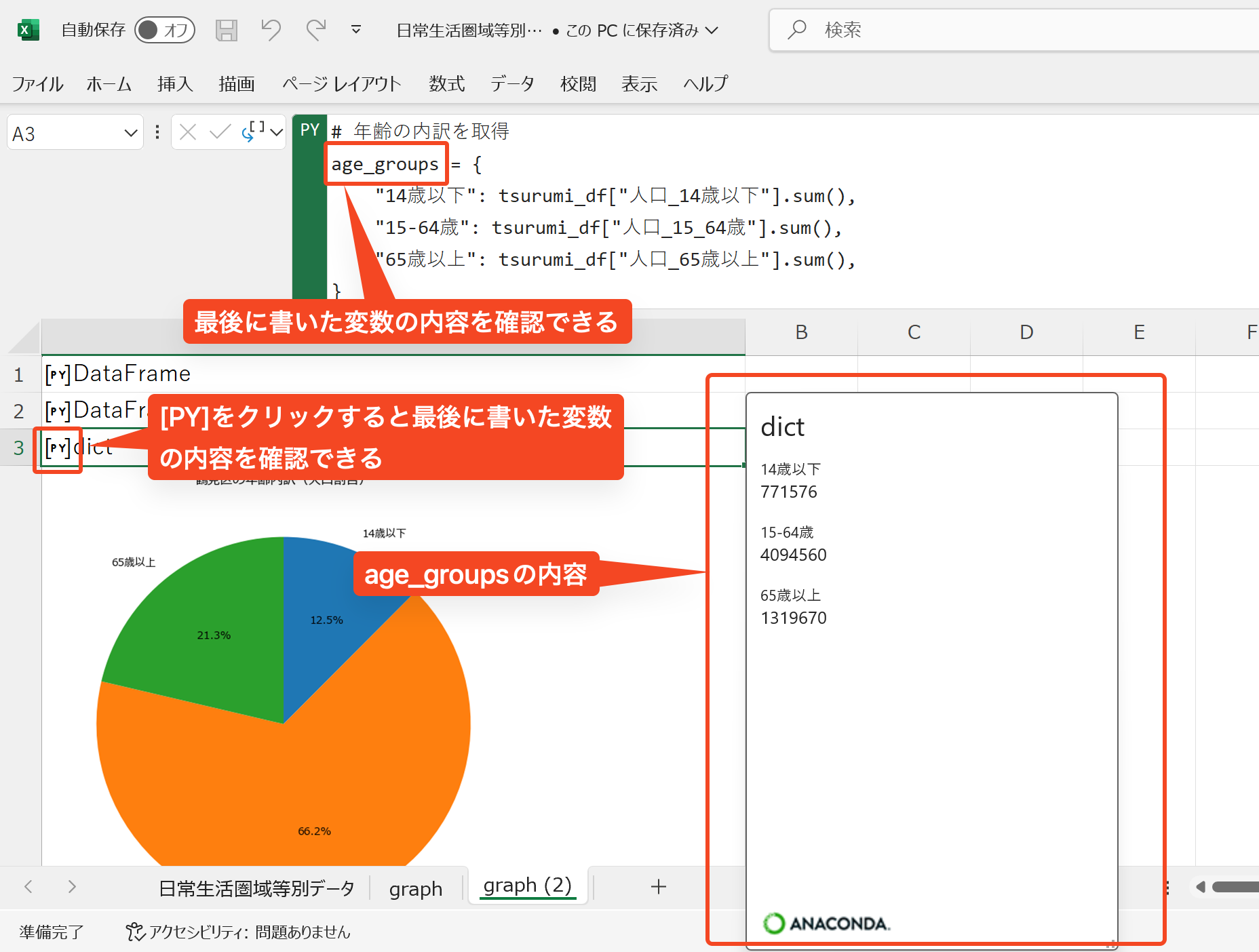 例として、横浜市のオープンデータから日常生活圏域等別データ(2018年3月~2024年3月)を使って、鶴見区の人口の年齢内訳を表す円グラフを作ってみます。 なお、Excelシート上のテーブルには「日常生活圏域等別データ」という名前を付けていることを前提としています。 以下のコードを見てください。すべての処理を1つのセルにまとめて書いています。