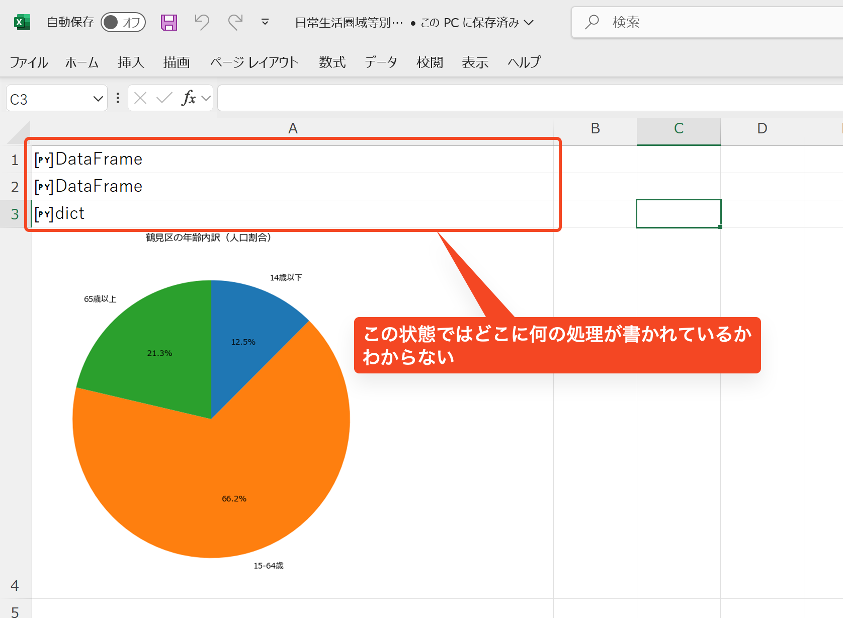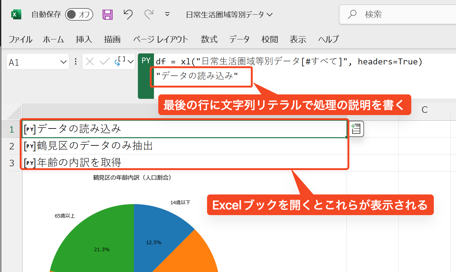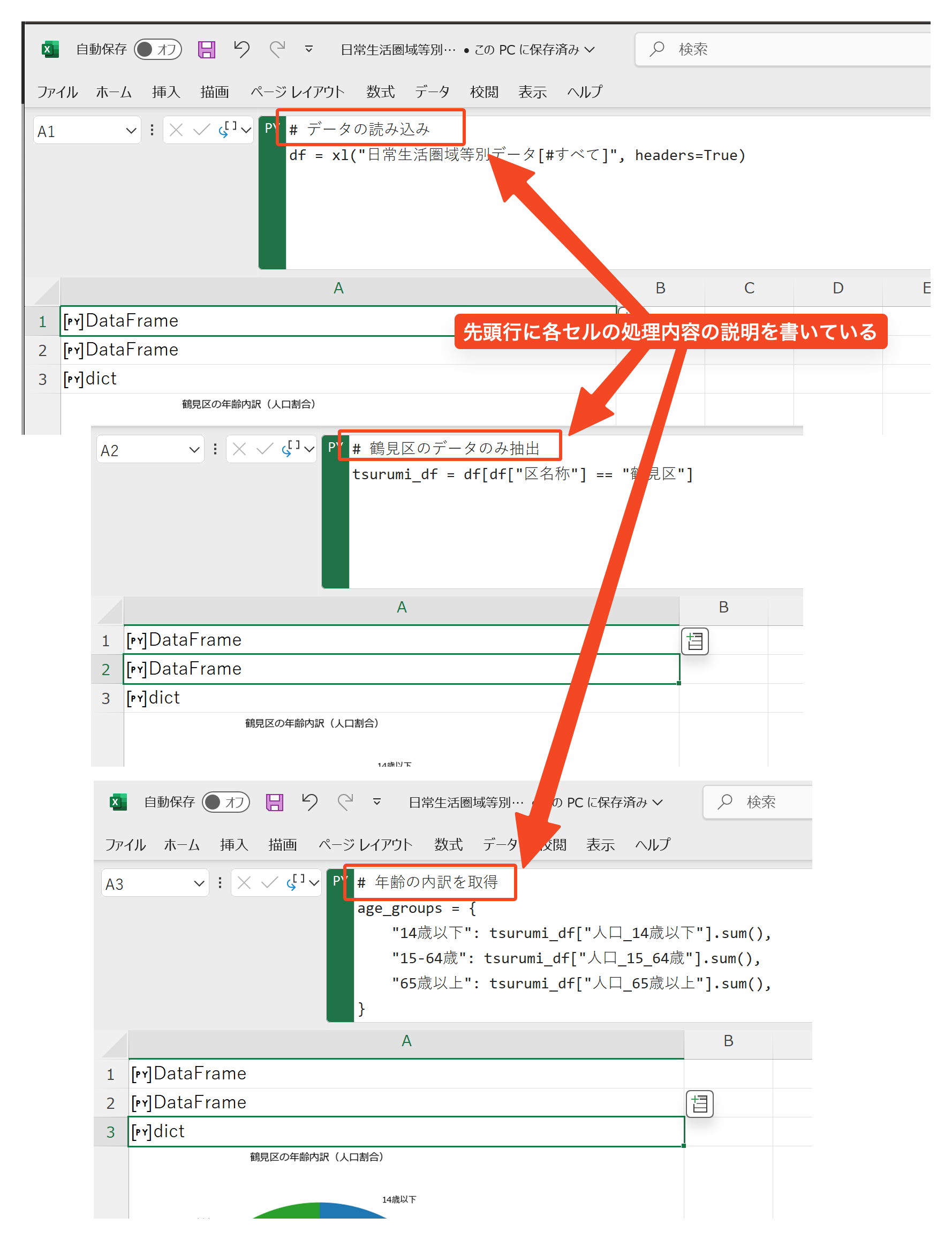 #でコメントを書くのはPythonの文法的には正しいのですが、Excelブックを開いたときにコメントが表示されず、[PY]DataFrameのようにPythonのオブジェクト名が表示されています。 これでは、全体の処理の概要を把握するには、各セルをクリックしてコードの内容を確認する必要があり、少々手間がかかります。