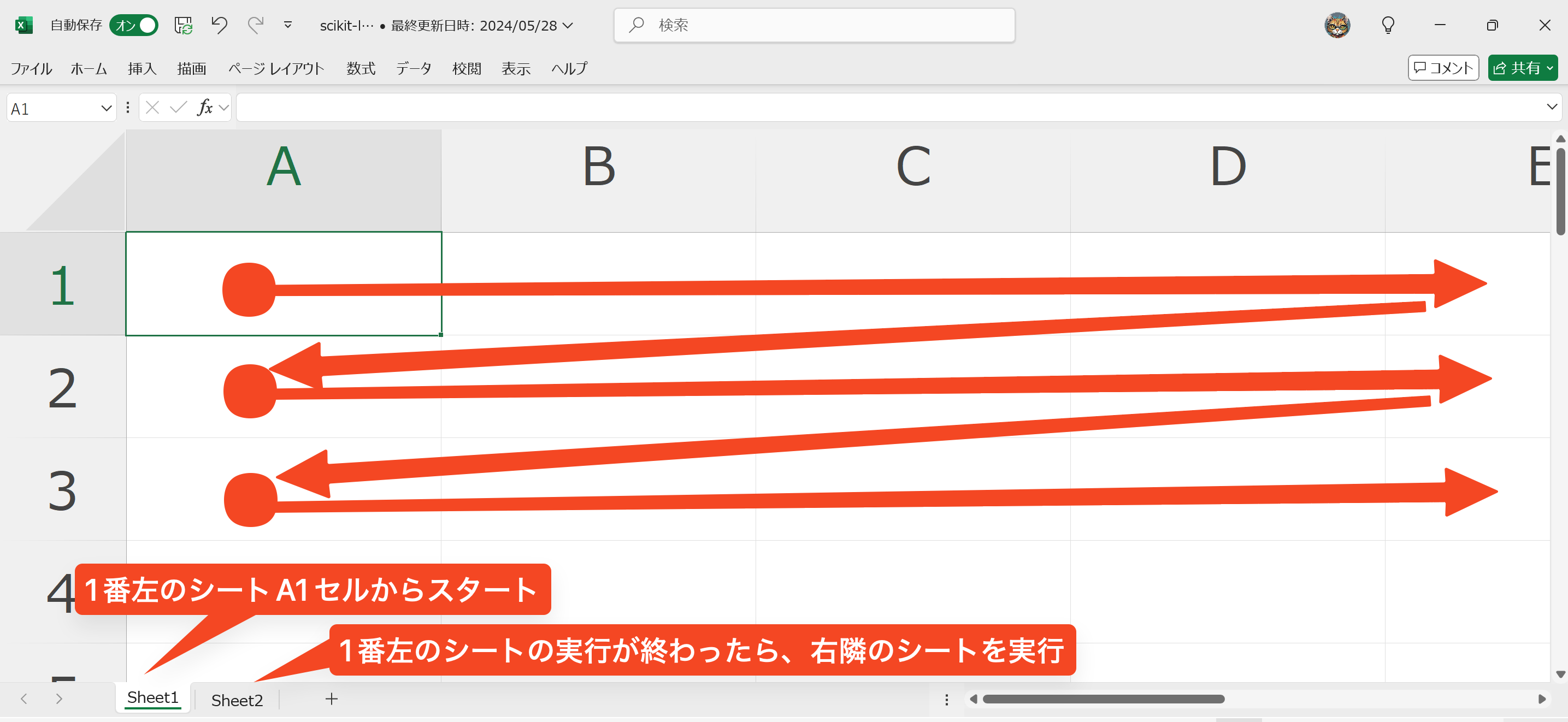1. 1番左のシートのA1セル(一番左上のセル)から右方向に1番右端まで実行